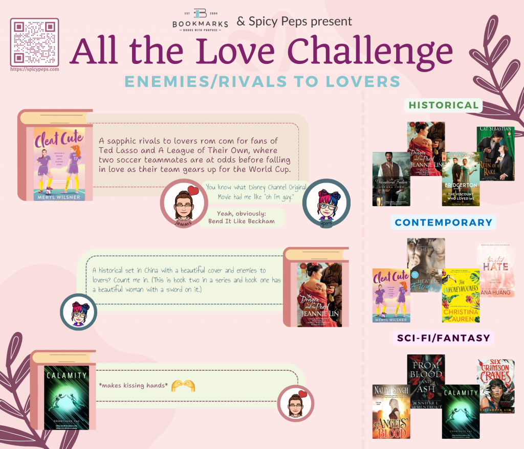 Delve into the world of romance with Spicy Peps and Bookmarks in our All the Love Reading Challenge! This challenge covers books of all types and spice levels, so no matter if you’re a romance regular or a newbie, you’re sure to find a favorite as we explore the this wide-ranging genre. And if you can’t get enough and want more to love, you can follow the Spicy Peps website.